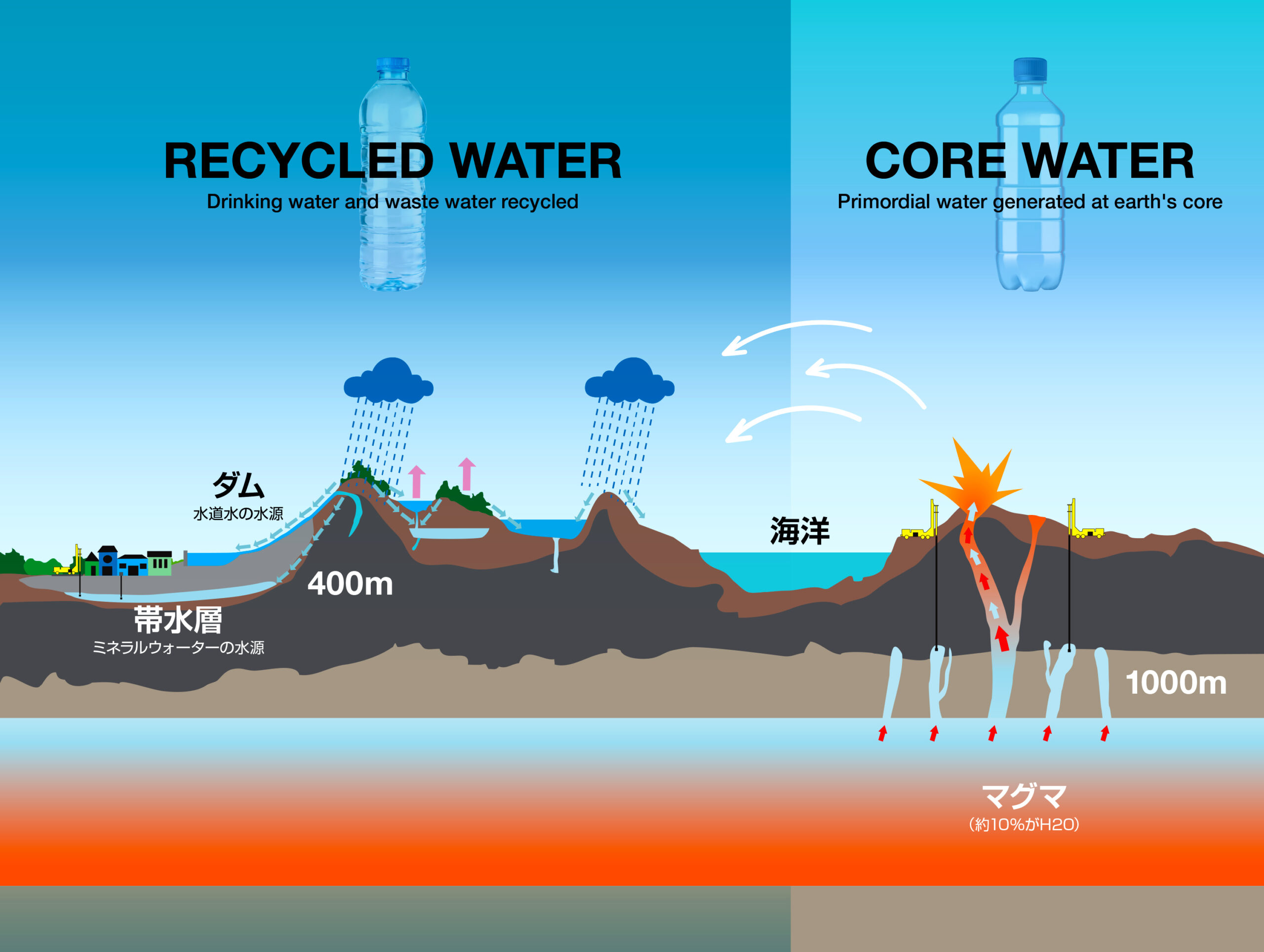 地球上には2種類の水循環が存在します。 1つは太陽エネルギーによる「大気水循環」。 飲料水の99%がこれに依存していますが、 化学物質による汚染など、 水環境の悪化が問題になっています。 もう1つは「一次水循環」と呼ばれる地球内部での水循環です。 地球のマントルに含まれ るH20が由来のため、大気循環でリサイクルされておらず、酸化や汚染からも守られています。BLUE GOLDのコアウォ ーター(温泉水) はこの一次水循環を水源とする安全な水です。